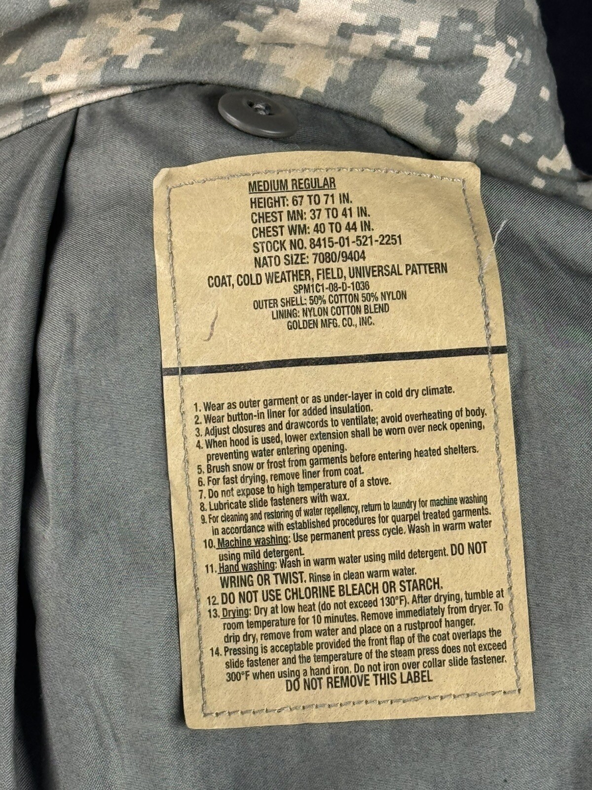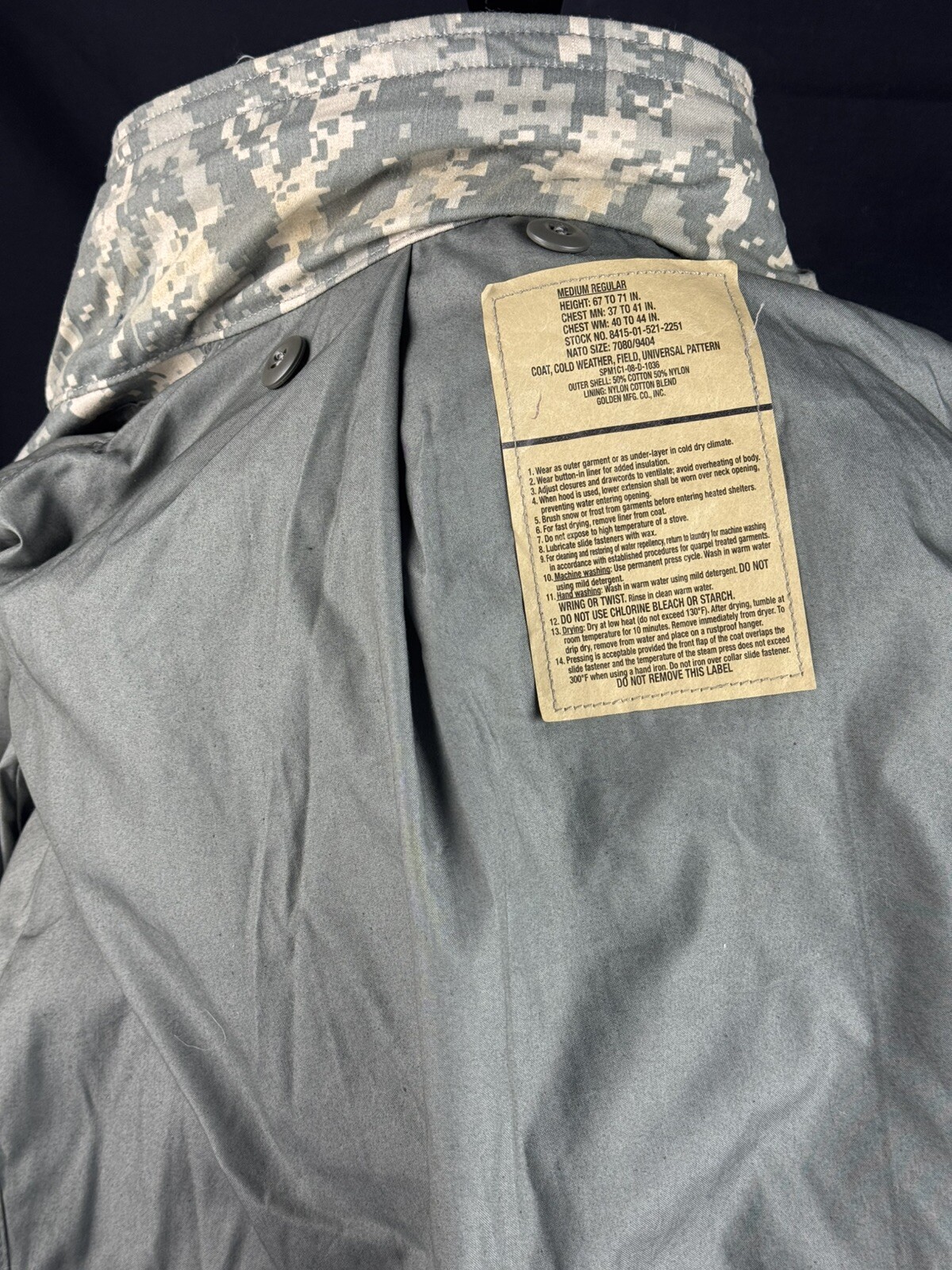 Condition: US Military Surplus, previously issued, used condition. No major holes or tears. Has all working parts, i.e. buttons, zippers, etc. DOES NOT INCLUDE LINER. Has a few stains from previous use, which can be seen in some of the photos on the listing. Would recommend dry cleaning before use. Please view all the photos carefully. We can also send more photos upon request.