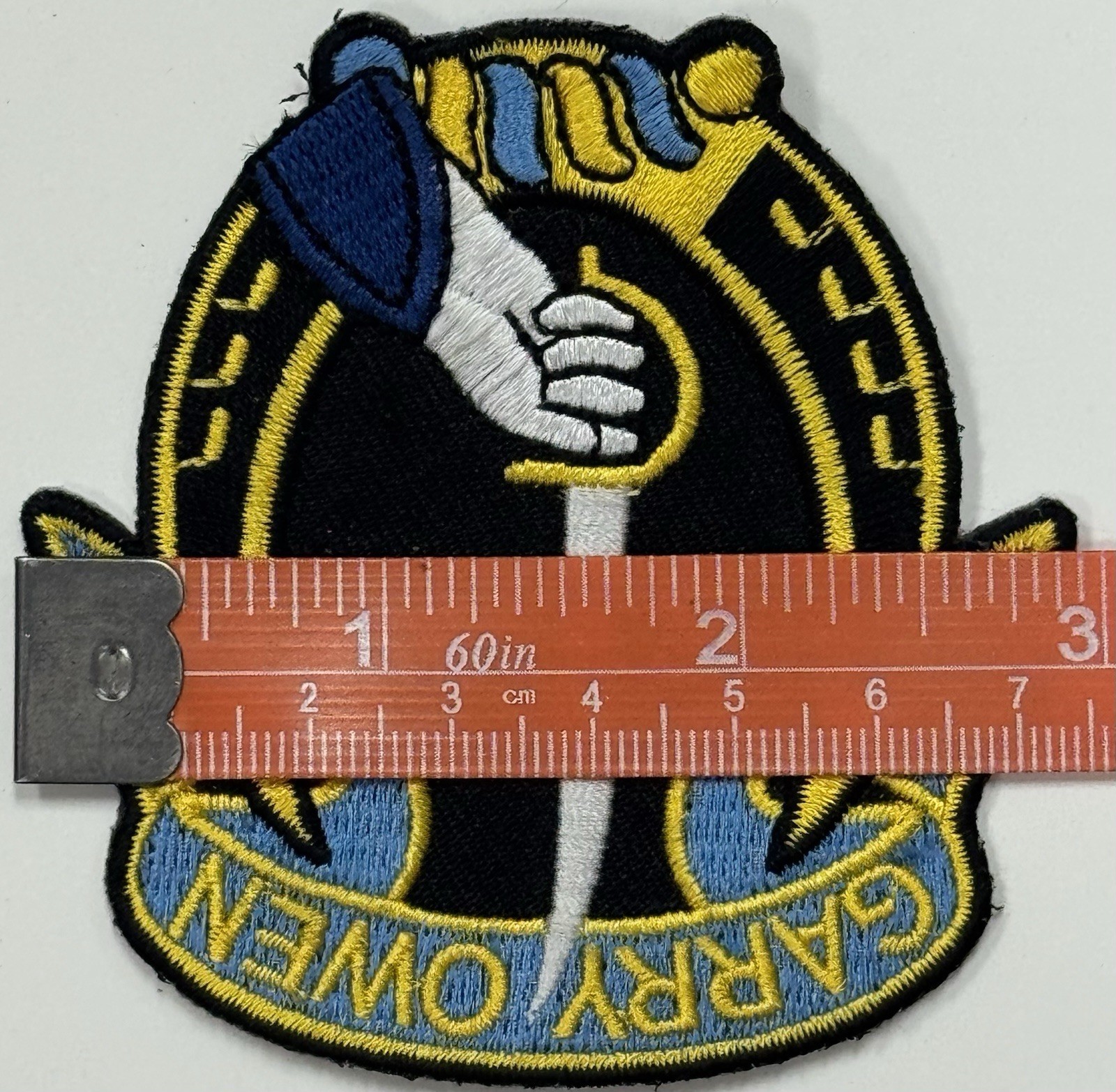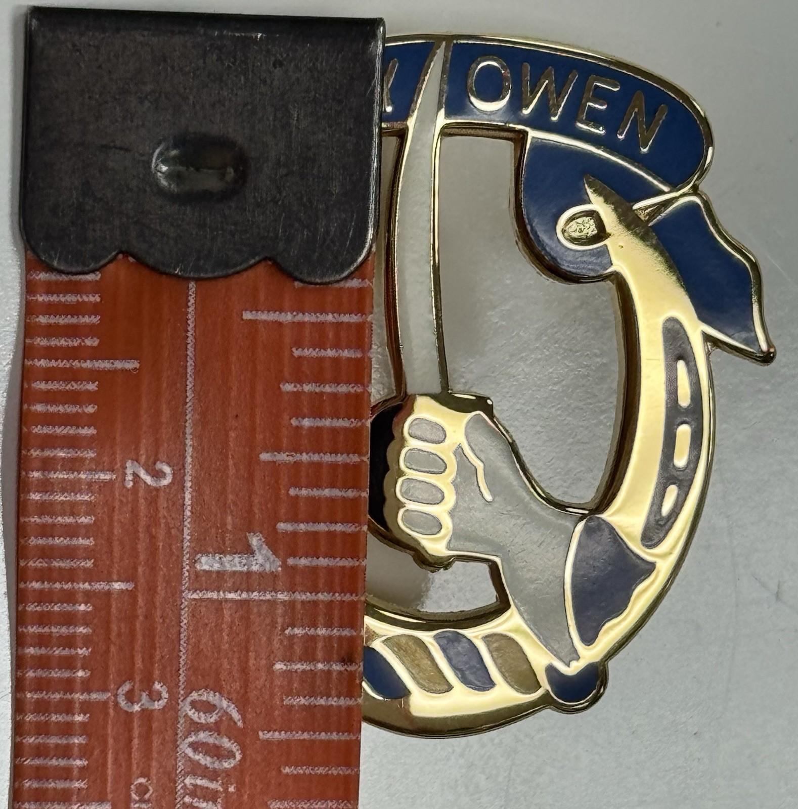 The gauntlet and saber at the "Charge" position are also adapted from the coat of arms and represent the "Cavalry Charge" and the battle heritage of the Regiment.