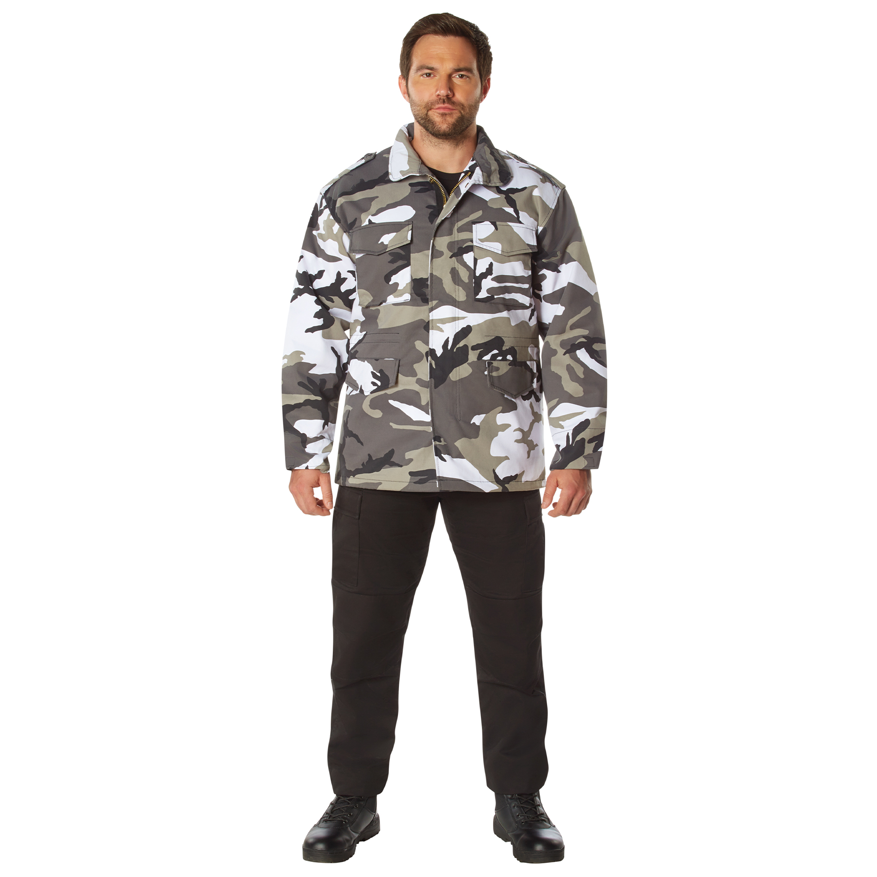 Rothco's M-65 Field Jacket features a water repellent poly/cotton twill exterior, which protects from wind and light rain, for added warmth the m65 coat comes equipped with a button-in quilted liner, which makes the military jacket ideal for cold weather conditions. In addition, the camouflage field jacket features a heavy brass zipper with snap-up storm flap, button down shoulder epaulets, concealed hood with drawstring pull, drawstring waist, and bottom, and hook and loop wrist cuffs ideal for securing your gloves. Rothco's field jacket also comes with four pockets including two large breast pockets with concealed snap closure and two large waist cargo pockets with concealed snap closures.