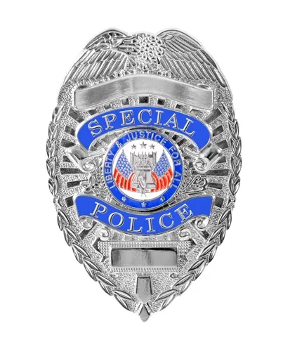 - Deluxe Police Badge Features “Special Police” On The Front Center And An Inner Emblem With “Liberty & Justice For All” Text And Liberty Bell Imagery