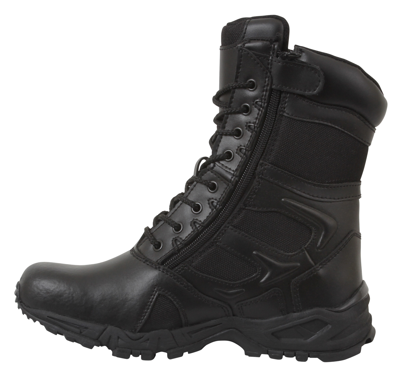 The Rothco Forced Entry Deployment Side Zipper 8 Inch Black Boot gives you the comfort of a sneaker in the form of a boot. Lightweight and extremely breathable these boots are great for long hours of wear. A moisture wicking liner keeps your feet dry and prevents the formation of blisters and skin breakdowns. These boots have been engineered to be as comfortable as a sneaker by using a dual sole that consists of an Eva midsole and a rubber outsole. This technology gives you a boot that can go from walk to jog to run without causing aching feet. A steel shank has been included in the sole to provide additional arch support. The leather upper is combined with nylon mesh to provide a breathable and flexible boot.