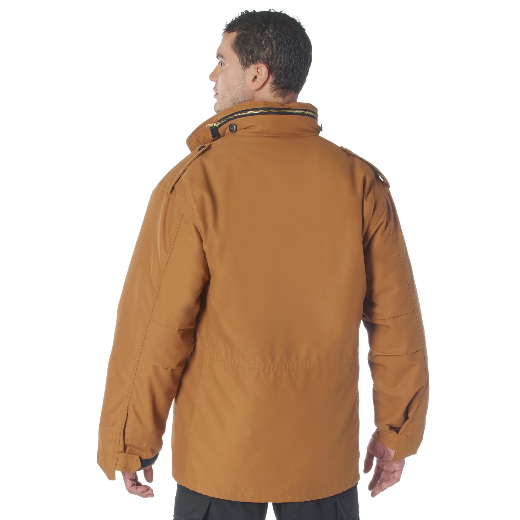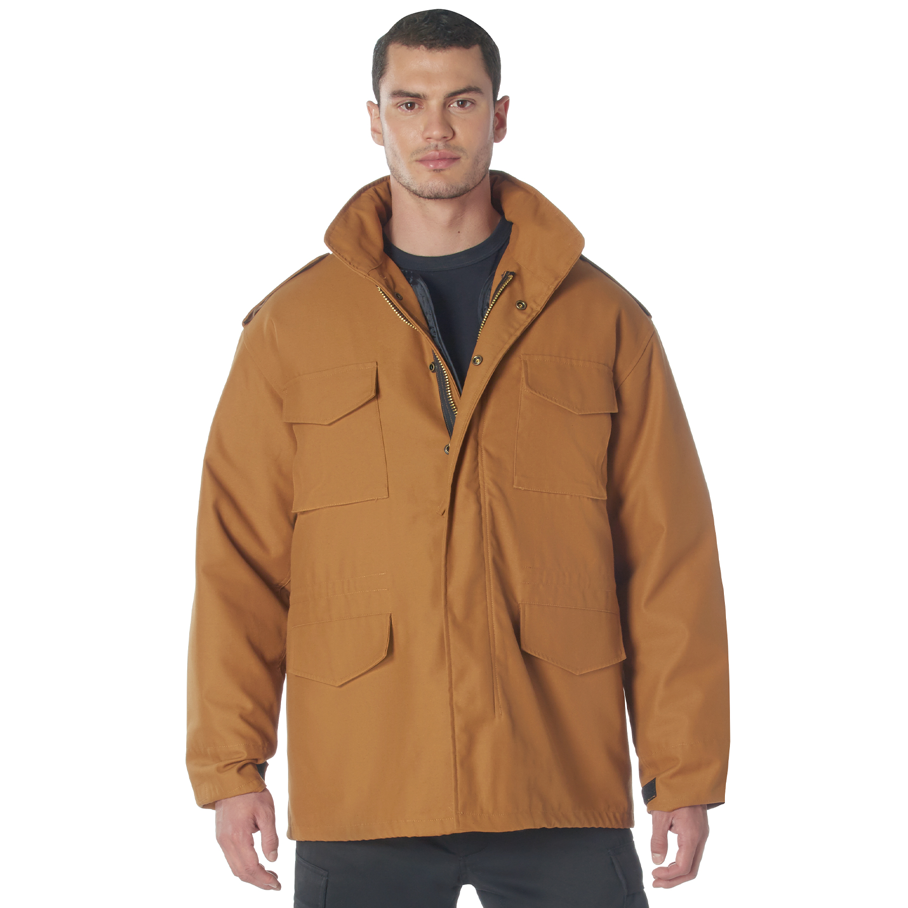 Rothco's M-65 Field Jacket features a water repellent poly/cotton twill exterior, which protects from wind and light rain, for added warmth the m65 coat comes equipped with a button-in quilted liner, which makes the military jacket ideal for cold weather conditions. In addition, the camouflage field jacket features a heavy brass zipper with snap-up storm flap, button down shoulder epaulets, concealed hood with drawstring pull, drawstring waist, and bottom, and hook and loop wrist cuffs ideal for securing your gloves. Rothco's field jacket also comes with four pockets including two large breast pockets with concealed snap closure and two large waist cargo pockets with concealed snap closures.