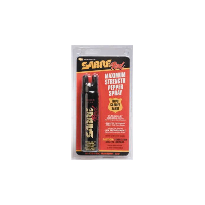 The Sabre Red Magnum 120 personal defense spray is an extremely effective option for law enforcement officers. The oleoresin capsicum formula contains 1.33 percent major capsaicinoids, making it 8 to 86 percent stronger than any other pepper spray available to civilians. It also contains an ultraviolet marker dye to make suspects easier to identify. Sabre's formulas are independently tested, ensuring that every canister packs the same knockout punch. Its stream dispersal pattern provides a range of up to 12 feet with reduced risk of blowback, and the large canister contains enough spray for around 40 short bursts.