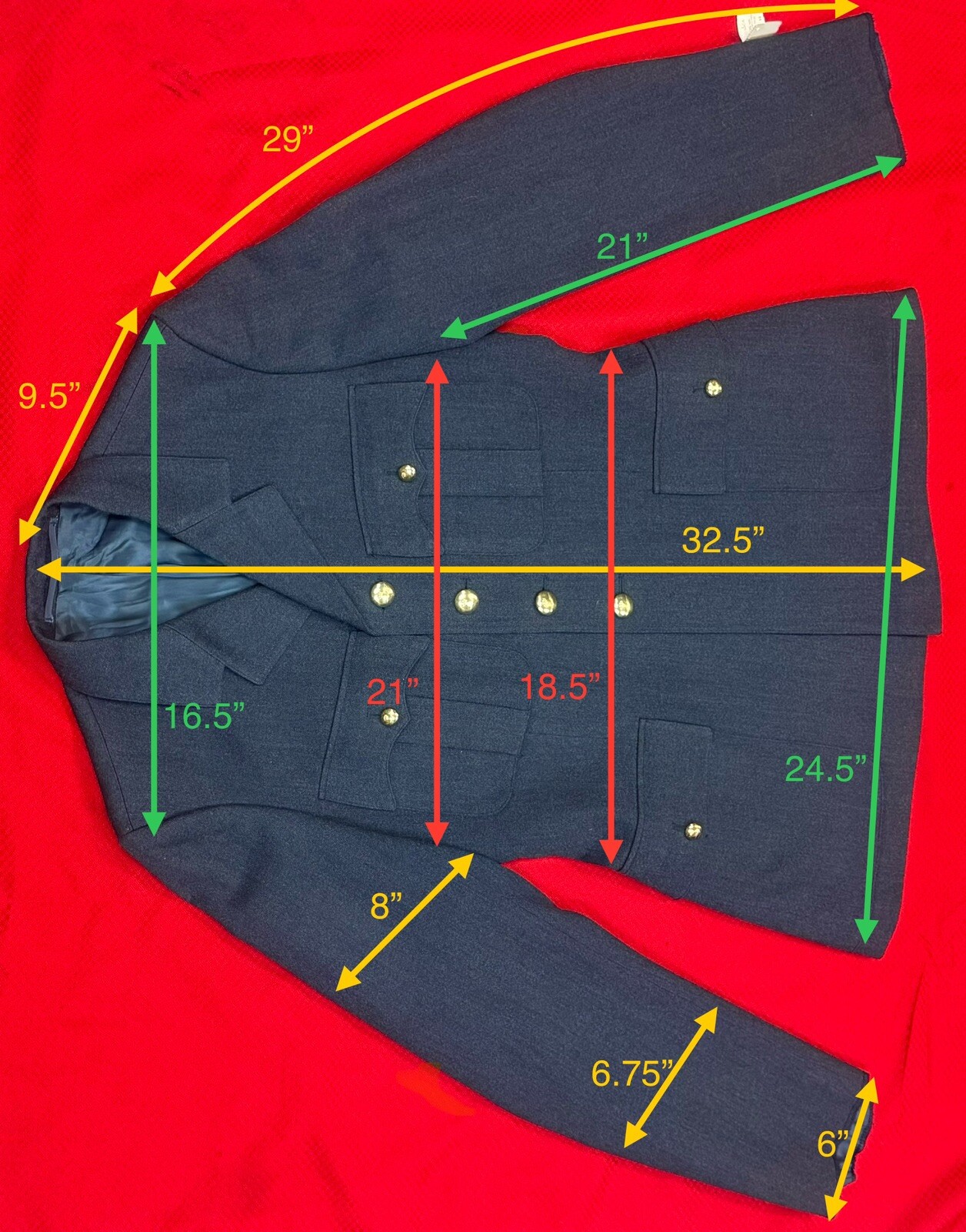 US Measurements: See LAST Photo on Listing for Measurements (Approx.) Measurements are in inches and are from coat laying flat.