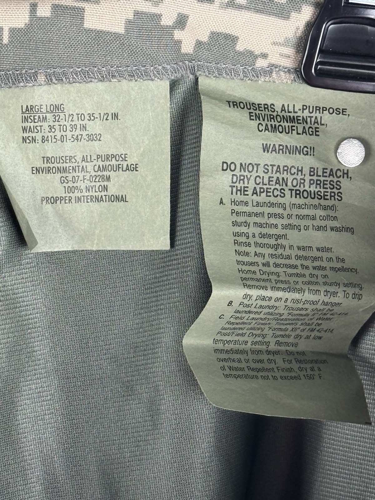 Condition: Excellent Used Condition; Previously issued; no major damages, holes, or tears, has all working parts (i.e. zippers, etc). There are a few dirt marks, dust, and/or debris from storage and/or prior use throughout. The pants have a name written on the inside; this cannot be seen when the pants are worn.