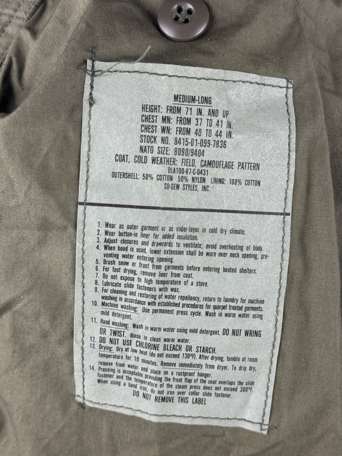 Condition: Excellent Used; The coat shows very mild use, including discolorations, fading, small snags, or other minor imperfections in fabric, and/or dirt from field use. Has all functional parts (i.e. zippers, buttons, etc.) All patches were removed and shows tiny pin marks where they were sewn on (above the chest pockets). No major holes or tears or damages; there is mild dust/debris from storage. Please view all the photos on the listing. Contact us if you have any questions, or would like us to send more photos.
