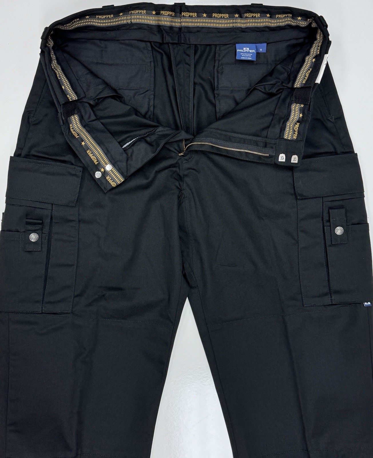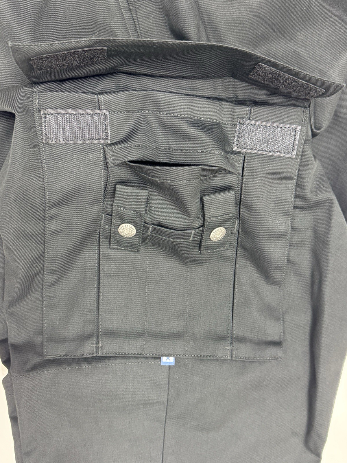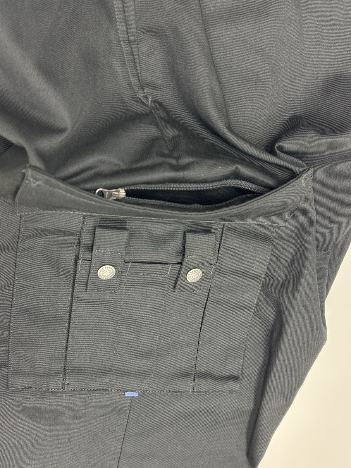 - Dual 6-way cargo/scissor pockets feature a hidden zippered pocket at the top.